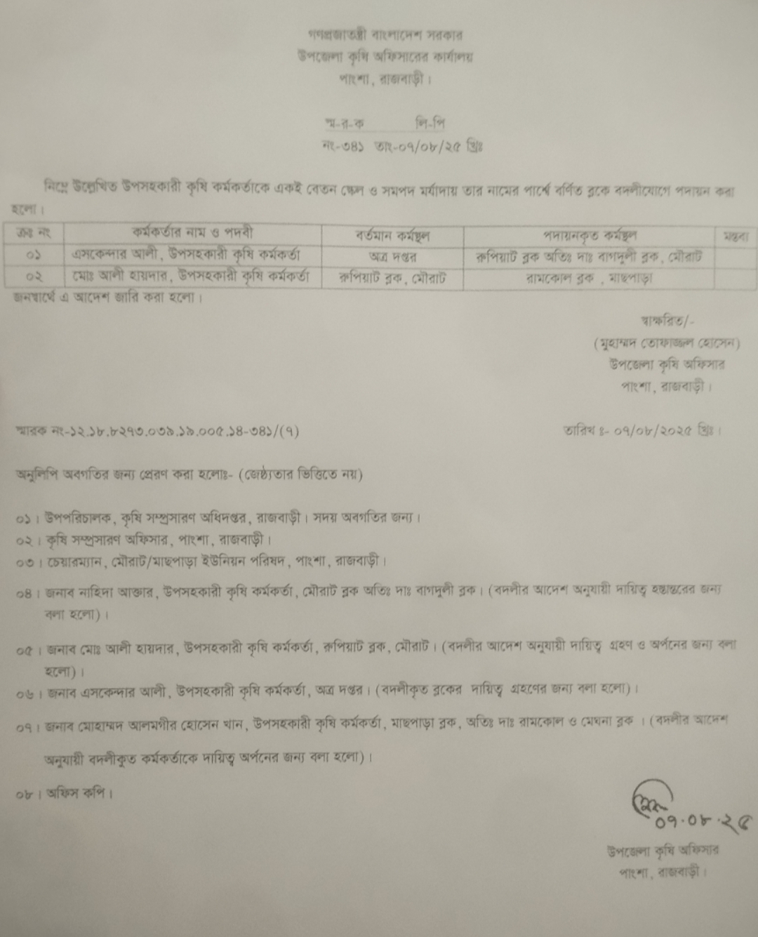 | ১ | বদলি/পদায়ন আদেশ | | ০৭-০৮-২০২৫ | দেখুন | |